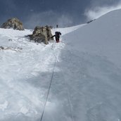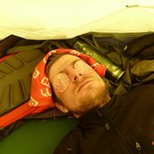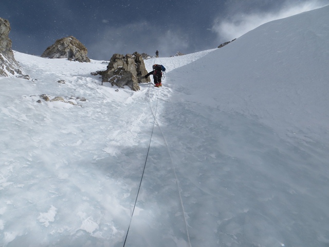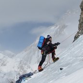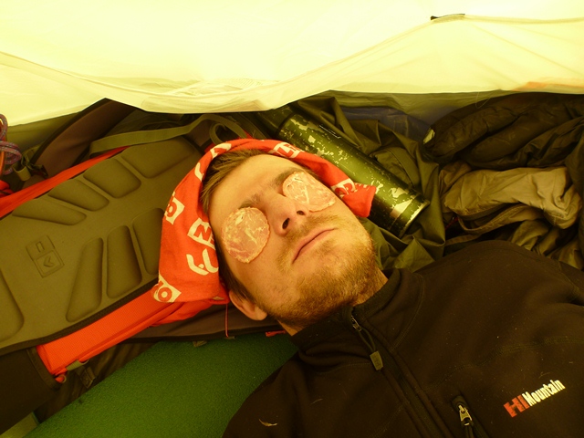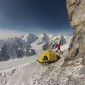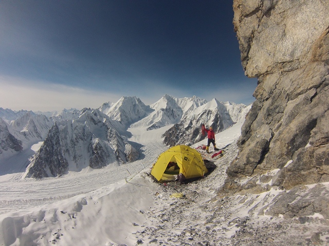 Powyżej camp 1 teren robi się bardziej stromy, kilka wyciągów lodowych wymaga więcej skupienia. Mijamy ostatnie miejsce do którego dotarliśmy podczas poprzedniego wyjścia. Dalej używamy poręczówek, które rozłożyli nasi przyjaciele z Pakistanu. Po 3h docieramy do „komercyjnego” campu 2. Jest on o 200 metrów niżej od naszego zamierzonego obozowiska. Postanawiamy, że rozbijemy się tutaj, bo zapada zmierzch, a wraz z nim następuje dodatkowy spadek temperatury. Namiot rozkładamy na małej platformie, niestety jego część zwisa z uskoku. Dla bezpieczeństwa całą konstrukcję przymocowujemy do śruby lodowej, dzięki temu w przypadku większego wiatru nie powinno nas zwiać ;). Noc przebiega bez ekscesów. Rano wychodzimy niespiesznie wraz z pojawiającym się słońcem. Doładowani dodatkowym depozytem osiągamy w końcu podstawę turni na 6300 m n.p.m. gdzie ma stanąć obóz 2. Z daleka wydawała się na kilkudziesięciometrową skałę, w rzeczywistości to 10-metrowy obelisk. Widać, że w tym miejscu rozkładało się wiele ekspedycji. Przygotowanie platformy, czyli wykopanie poprzednich kilku namiotów, wyrównanie terenu i odkrycie kilku „skarbów” zajmuje nam ponad 2 godziny. Namiot wzmacniamy na wszystkie możliwe sposoby, przymocowując go do starych haków i szabli śnieżnych. Dokładamy też krótką poręczówkę, żeby trawers dojściowy był bezpieczniejszy. Resztę dnia gotujemy i jemy, czekając na Maćka i Adama , którzy rano wyszli do góry. Docierają do nas zaraz przed zapadnięciem zmierzchu. Adam w lekkim stanie hipotermii, bo postanowił dojść do obozu prawie w samej bieliźnie. Namiot mieści naszą czwórkę, ale ostry wiatr przez całą noc skutecznie utrudnia spanie. Ostatecznie Artur śpi jak kamień, Maciek spał jednym okiem i jedną nogą, Adam czekał na atak szczytowy, a ja miałem wizję Kazimierza Głazka, której nie potrafię do końca wytłumaczyć… Rano długo mobilizujemy się do wyjścia. Ja z Arturem idziemy przodem i zużywamy ok. 250 metrów lin, łącząc kawałki starych i nowych poręczówek. Artur prowadzi ostatnie trudności powyżej camp 2. Chłopaki za nami idą obładowani sprzętem biwakowym do założenia „trójki”. Razem docieramy do śnieżnej grani na ok. 6600 m n.p.m. Postanawiamy w tym miejscu zostawić cały depozyt i szybko ruszamy po poręczach w dół. Blisko camp 1 spotykamy Krzyśka, Karima oraz Shaheena i Amina, którzy planują spędzić noc w dwójce. Ekspresowo po 3,5h meldujemy się w base campie. A tu czeka na nas lunch, herbata i ciepła messa. Czas na zasłużony rest… |