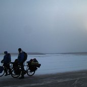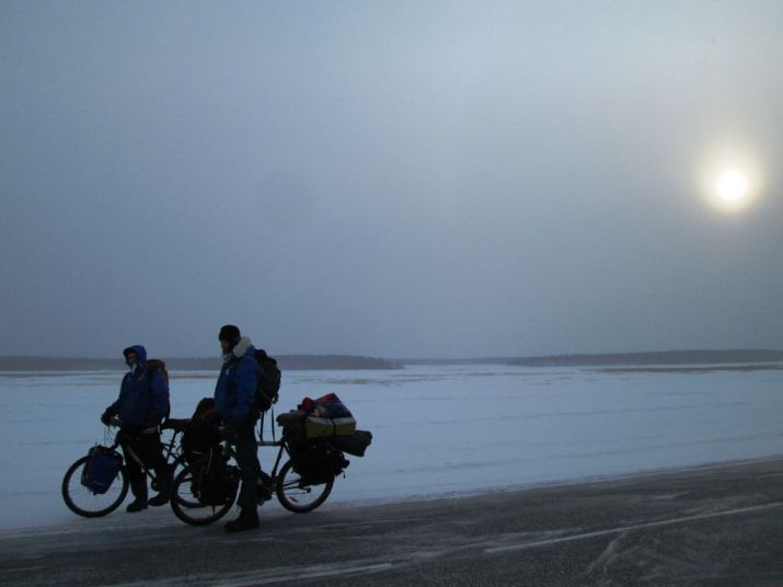 Rowerzyści jadą obecnie po zimniku ─ specjalnie przygotowanym odśnieżanym szlaku wyznaczonym po zamarzniętych rzekach. Zwykle przemieszczają się ubitym śniegu, czasem jednak rowery trzeba pchać.